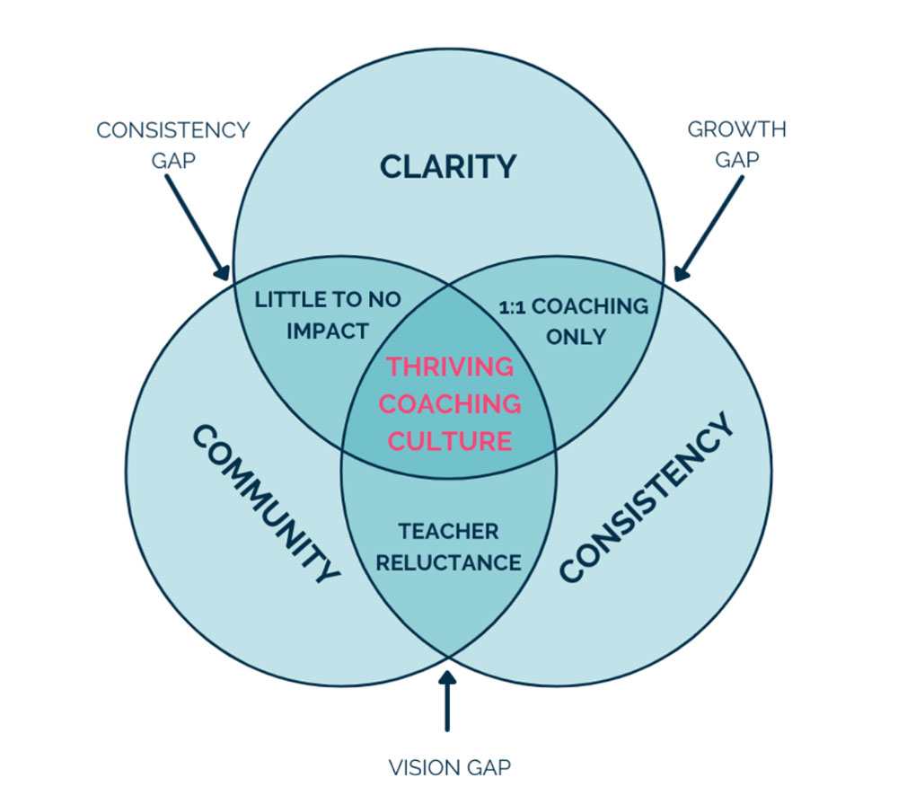 When schools have a growth-minded community and consistency in coaching practice but a lack of clarity around the vision for coaching, this often results in teacher reluctance to participate in coaching, or a “vision gap.” When schools have consistency in practice and clarity in vision, but lack a growth-minded culture, this often leads to coaches working almost exclusively with the “willing” teachers and becoming stuck working at the individual (one-to-one) level, or a “growth gap.” When schools have clarity around coaching and a growth-minded culture, but a lack of consistency among coaches or coaching practice, this often results in little to no impact from coaching, or a “consistency gap.” These gaps can be closed through an audit of the coaching program that intentionally addresses the missing components in each phase of the Thrive Model.