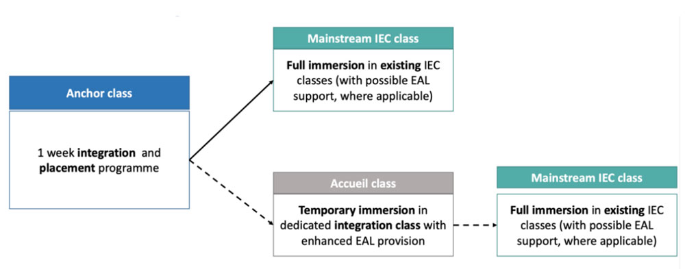 All secondary students immediately joined a reception class (Anchor class) for one week in order to welcome the students and introduce them to the workings of the school (see figure 1). At the end of each Anchor week, decisions were made as to where students from that week’s cohort would be placed. The ultimate aim was to enter all students into mainstream classes, but those students whose English skills were too weak to manage in mainstream education joined an “Accueil class” temporarily in order to support them in honing the skills they required to join the mainstream.