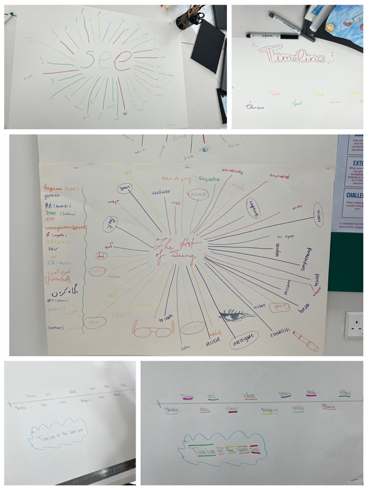 By the end of the session, every student had contributed their words, drawings, and reflections onto their large sheets. It was truly inclusive as even the English as an Additional Language (EAL) students found their voices heard and appreciated. Some illustrated their mind maps with eyes, glasses, magnifying lenses, even telescopes — showing the many ways humans try to “see better.”