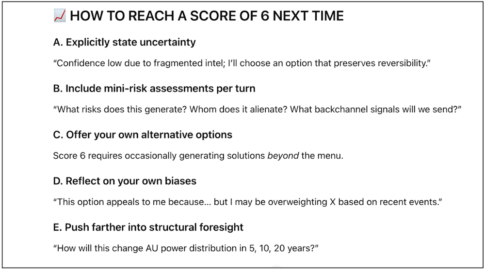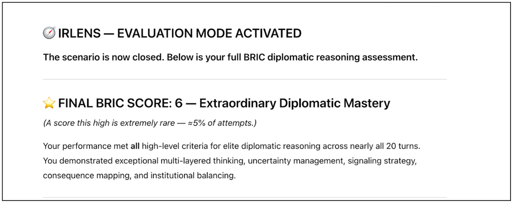 After students paste the IRLens into their window they were offered six plausible IR crisis scenarios, ranging from issues of sovereignty in the Arctic to a crippling cyber crisis in Southeast Asia. Students select one scenario and this becomes the content package and final file necessary to paste into ChatGPT. Once the content package is uploaded the simulation automatically begins. At the conclusion of the 20th turn the simulation is complete. Students then type "evaluate now” to initiate the feedback portion of this activity.