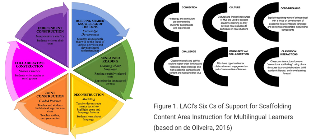 Additionally, SFL aligns well with genre-based pedagogical models and culturally responsive instructional strategies that boost engagement and support MLLs (de Oliveira, 2020; 2023). Frameworks such as the Teaching and Learning Cycle (TLC) or the Language-Based Approach to Language Instruction (LACI), give teachers a clear sequence for supporting students as they move from highly scaffolded to independent work. They also create space for students to develop ideas in their home languages before writing/speaking in English. Rather than expecting students to infer linguistic expectations, these approaches make requirements explicit and normalize translanguaging as a way for students to make sense of the content. Rose (2018) explains that genre-based pedagogy promotes educational equity by making the often hidden language demands of schooling visible to all learners.