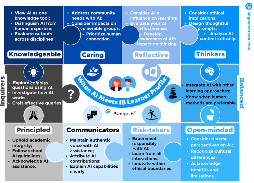 When AI meets the Learner Profile, we see "Principled" students who uphold academic integrity and acknowledge AI assistance. We see "Reflective" learners who evaluate their own AI effectiveness and consider its influence on their thinking. By mapping AI behaviors to these profiles, we normalize responsible use as part of their character development.