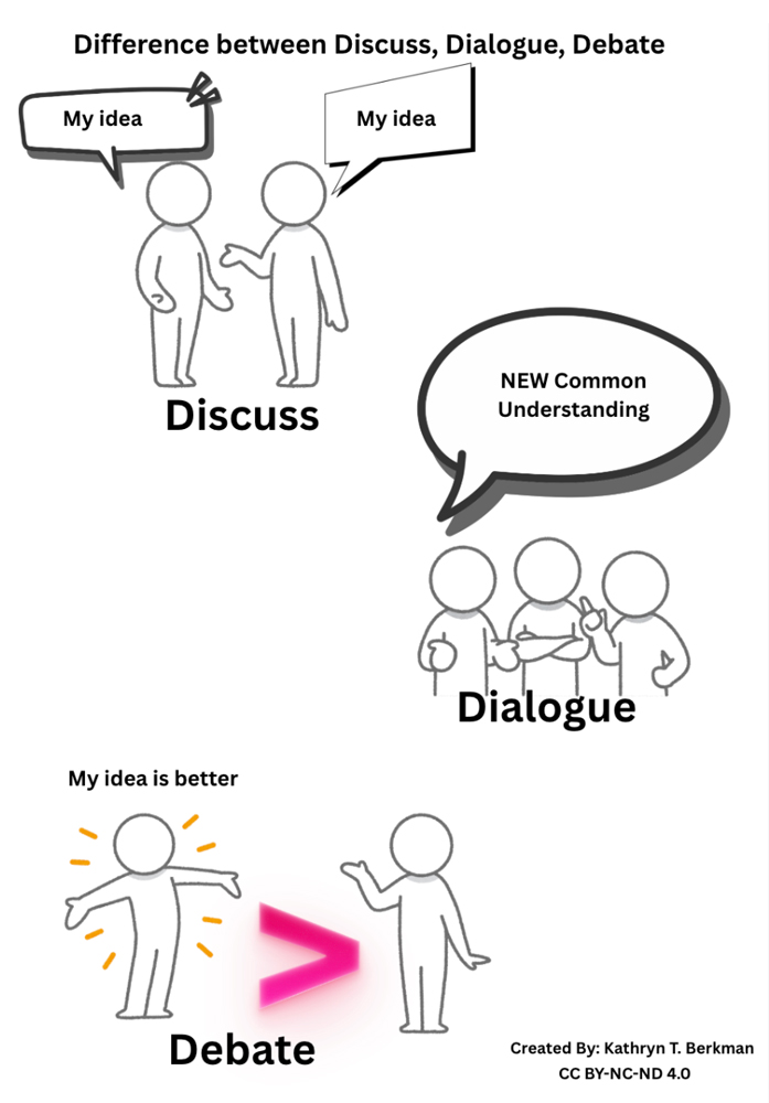 To help students navigate these complexities and build the self-awareness Maha describes, educators can start with structured classroom practices to help them develop their dialogue skills. Students should be taught what dialogue is and what it looks like, sounds like, and feels like. Below is a graphic Kathryn created to show the difference between discussing, debating, and dialoging.
