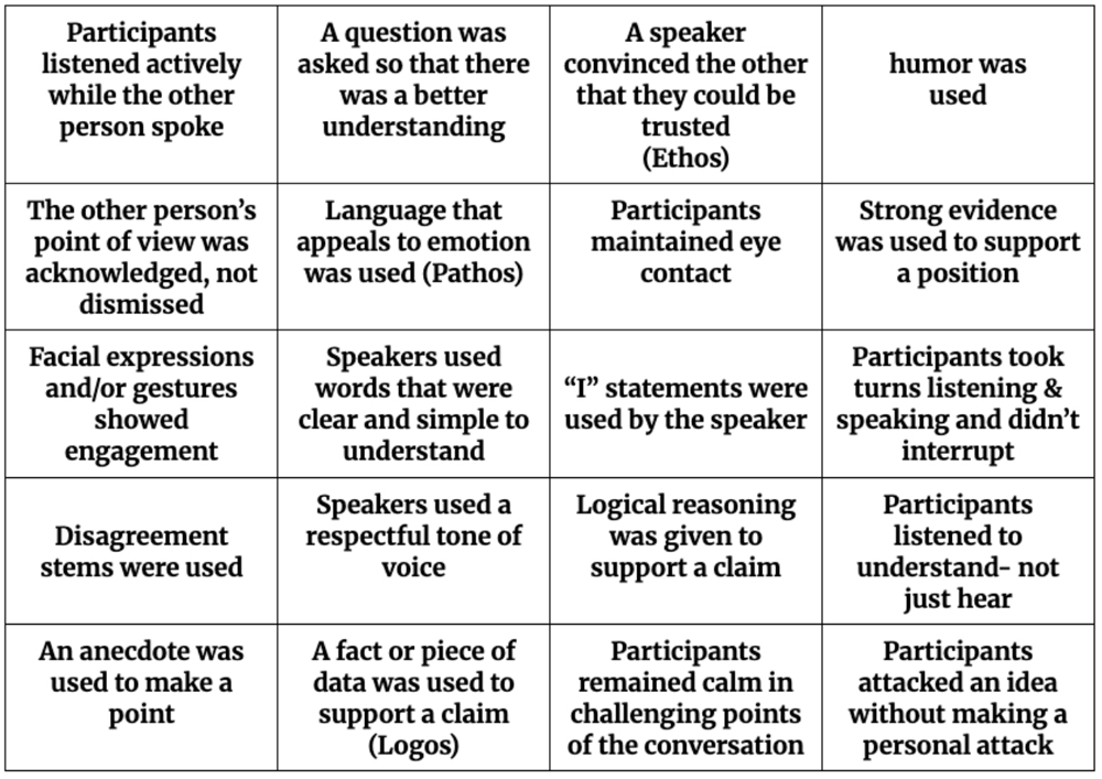An example of a useful tool from the civil discourse curriculum is this conversation card, which asks students to reflect on their own and their classmates’ participation in a dialogue. It can help students become more aware of what they say and do during conversations with others, moving them from passive listeners to intentional participants in the pursuit of mutual understanding.