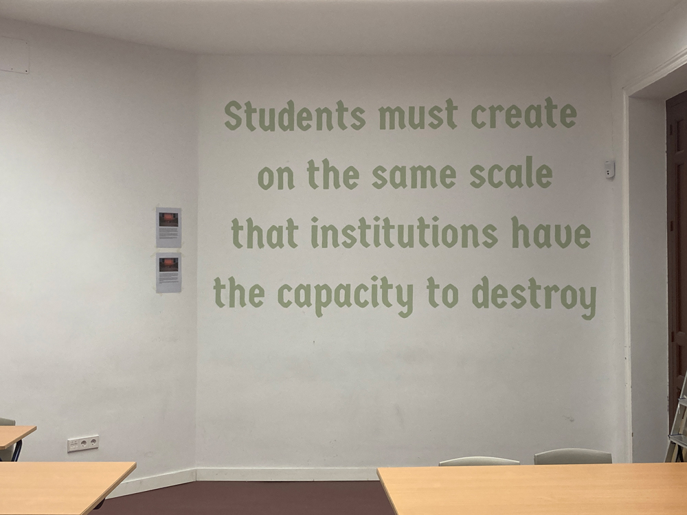 Classroom mural created by an Ecological Humanities class, adapted from a directive by Sherrie Rabinowitz. Original, 1984: "Artists need to create on the same scale that society has the capacity to destroy." (Photo source: Jared Rock)