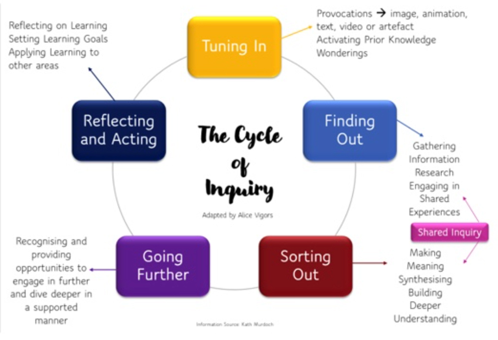 Reflecting and Acting is an essential component of The Cycle of Inquiry as outlined by Kath Murdoch, author of The Power of Inquiry. In the diagram below, reflection is given equal weight when compared to other parts of an inquiry unit.