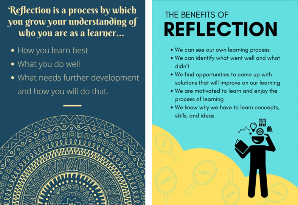 (From left to right) What is Reflection? and Benefits of Reflection posters created by members of Team 7 at AES New Delhi. (Photo source: Megan Vosk)