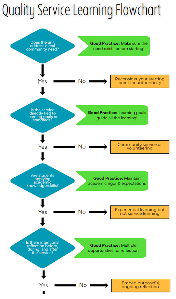 Quality Service Learning Flowchart: Laurence Myers, from Edvolution Services, created a diagram to help students and educators reflect on different aspects of their community engagement experiences. Laurence said, “All too often, educators with limited experience in community engagement feel that the move to more authentic and student-driven learning will be overwhelming. Reflection on the decisions, the outcomes, and the learning itself is a critical piece to recognizing your own capacity to make change for a larger scope than yourself.” You can see a portion of the diagram below.