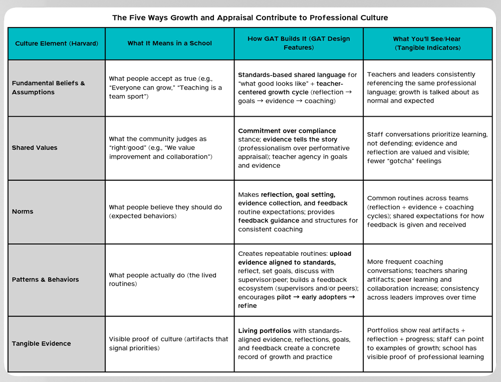 That is when growth and appraisal becomes culture-building in the fullest sense. It helps a school create a shared truth about good practice, align adults around common values, normalize reflective and collaborative work, build routines for improvement, and produce visible evidence of professional learning.